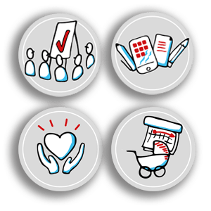Vielschichtige Sachverhalte einfach auf den Punkt bringen. Wie in diesen Icons für die Stadt Freiburg. Die Idee: einfache Symbole, die durch den umgebenden Kreis Halt und Konsistenz erhalten. Im Bild: Icons für die Themen Team-Vereinbarung, Schulungs-Tools, Pflege und Elternzeit.