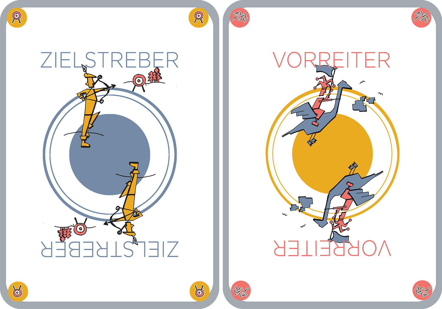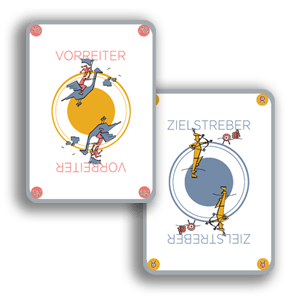 Aufgabe war die Visualisierung von Werten, die das Denken und Handeln innerhalb einer Organisation und hier insbesondere der Führungspersönlichkeiten auf den Punkt bringen sollten. Die Idee: ein Werte-Quartett. Im Bild: die beiden Motive zu den zentralen Werten Zielstrebigkeit und Innovationskraft.