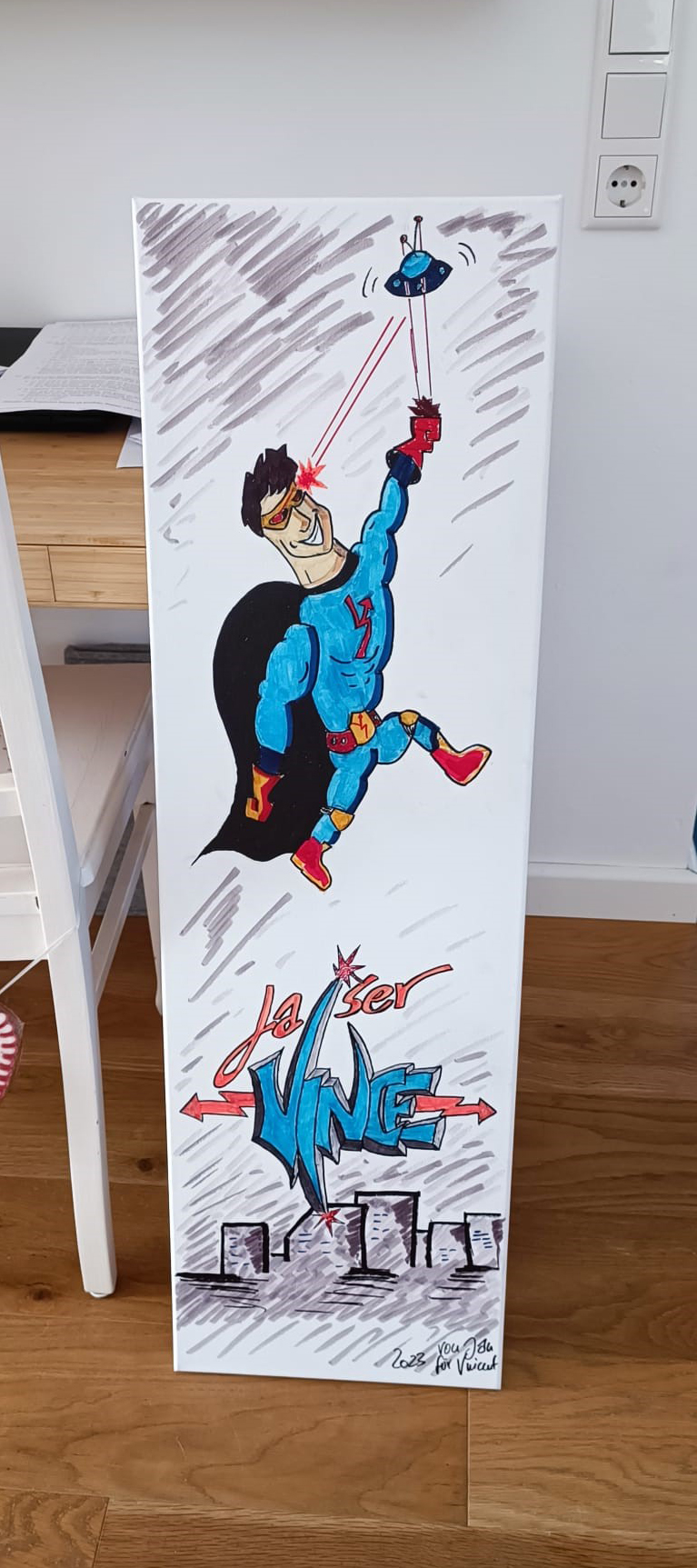 Es sollte ein besonderes Geschenk für mein Patenkind sein: Gemeinsame Zeit. Ich bringe eine Box Künstlerstifte und Leinwände mit und wir malen gemeinsam. Denn das kann er richtig gut. Meine Aufgabe: Vincent als Superhelden malen. Im Bild: Laser Vince, der mit seinen Laserfäusten eine außerirdische Invasion in die Schranken weist. Entstanden in Kooperation mit dem Helden selbst.