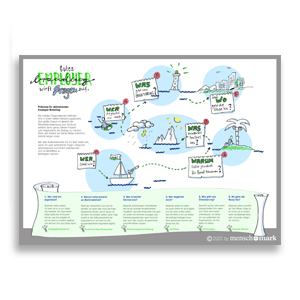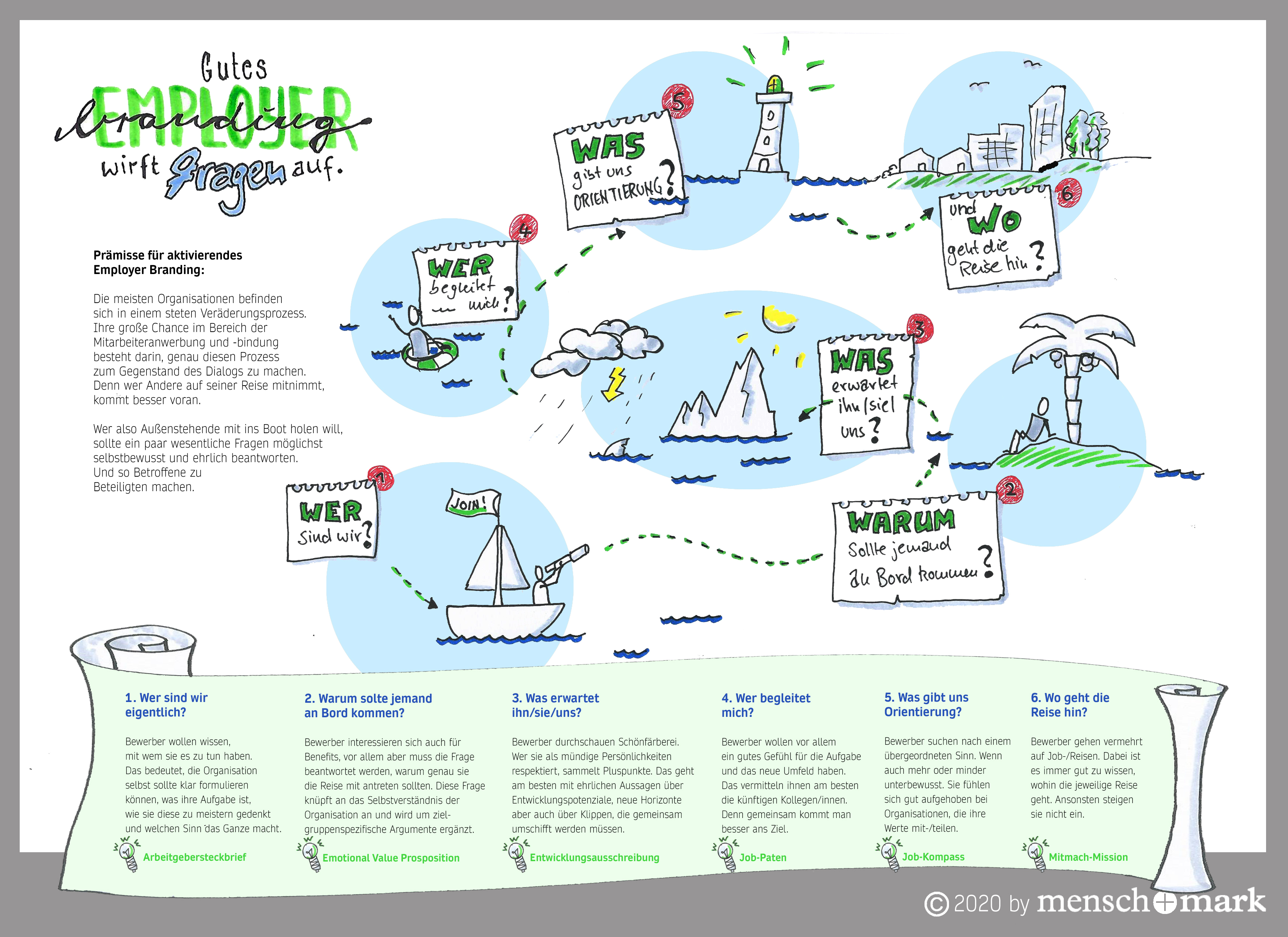 Gutes Employer Branding wirft Fragen auf. Habe ich mir nach etwa 15 Jahren gedacht. Die Idee: Und diese Fragen versucht in einer Übersicht auf den Punkt zu bringen. Im Bild: Die Reise durch den Leitgedanken Wer sagt was und wie zu wem?