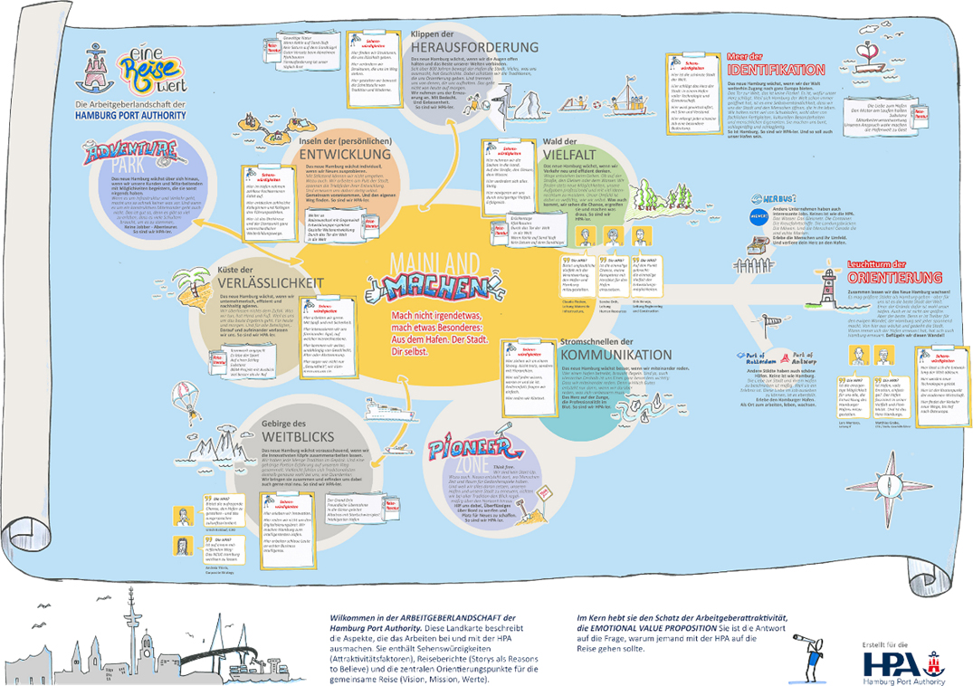 Das Wissen ist in der Welt. Man muss es nur erkunden – und festhalten. Die Idee: Inhaltssammlung mithilfe einer Contentmap oder Lernlandkarte oder wie auch immer. Im Bild: die Ergebnisse aus einem kompletten Employer Branding Projekt (Management Workshop, Mitarbeiter-Story-Camps und persönlichen Gesprächen) für die Hamburg Port Authority.