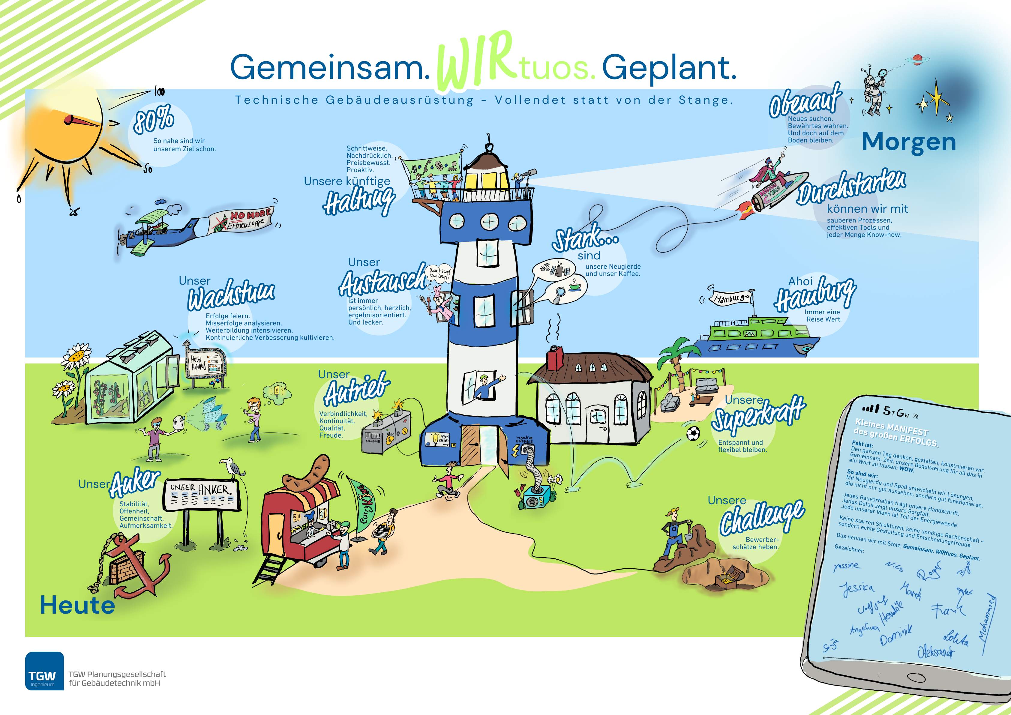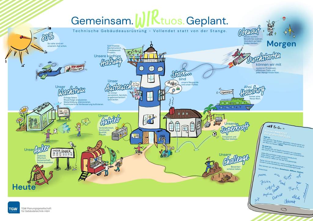 Haltung zum Ausdruck bringen, intern wie extern, darum ging es beim eintägigen Workshop mit der TGW Planungsgesellschaft in Hannover. Alle Mitarbeitenden entwickelten gemeinsam ein Selbstbild der Unternehmensidentität. Die Vorlage habe ich anschließend digital aufgepeppt. Sie dient nun als Strategiebild und inhaltlicher Kompass für die Zusammenarbeit im Team und mit den Kunden.