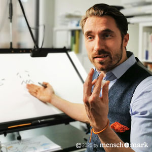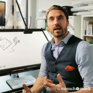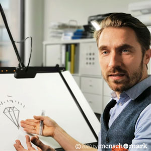 „Die Glaubwürdigkeit und das Annehmen von Bildern in Unternehmen steigt, wenn man es mit den Menschen gemeinsam entwickelt“, weiß der studierte Illustrator, der neben dem Graphic Recording mit seiner Agentur Die Zeichner unter anderem Strategie- und Visionsbilder entwickelt.