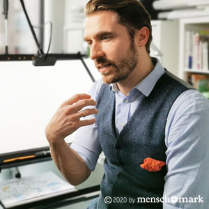 Kleider machen Leute. Und transportieren Haltung. Weste, Einstecktuch, Armband – alles farblich passend abgestimmt. Eine Botschaft. Ein intensiver erster Eindruck. Bereits aus meinem ersten Gespräch mit Markus Gull habe ich mitgenommen, dass Haltung wertfrei ist. Man könnte auch sagen, Haltung hinterlässt Eindruck, unabhängig davon, wie wir ihn interpretieren. Andreas Gaertner hat mich sehr beeindruckt: Er ist nämlich nicht nur ein unglaublich sympathischer Zeitgenosse, er ist inspirierender Gedankengeber, ein guter Zuhörer und zudem wahnsinnig stilsicher gekleidet. Zu seinem Outfit sagt er: „Ich habe mich für diesen Stil entschieden, weil ich mich darin wohlfühle. Es ist wie eine Uniform, im besten Fall ein positiver Panzer, der mir Sicherheit gibt. Ich mag es, wenn alles zusammen passt. Denn die Art, wie man sich kleidet, transportiert auch, wie man seinen Job tut, wie man mit sich umgeht, und mit anderen.“ Und fügt schmunzelnd an: „Es gibt eine Studie, die herausgefunden hat, dass Menschen, die Zahnseide benutzen, länger leben. Das ist natürlich nur eine Korrelation. Aber Menschen, die Zahnseide nutzen, achten mehr auf ihren Körper. Das ist eine Frage des Bewusstseins.“